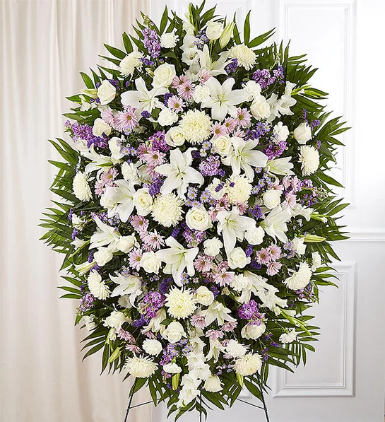 When words alone cannot convey the feelings in your heart, flowers can provide a meaningful and profound statement. Our impressive standing spray arrangement is meticulously handcrafted by expert local florists with soothing lavender and white blooms for a lush, full presentation, presenting an elegant and memorable tribute.