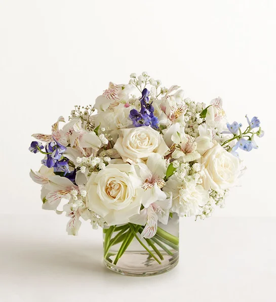 Express your sincere condolences with our elegant all-white arrangement of roses, lilies, stock, daisy poms and monte casino. A peaceful tribute that offers treasured memories of loved ones.